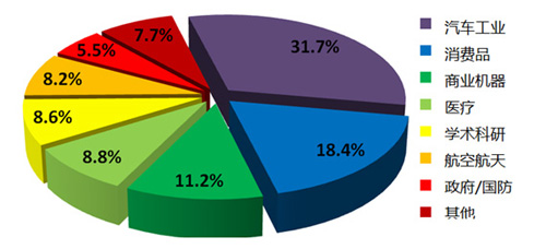 (3D打印技术在各行业的应用市场份额)